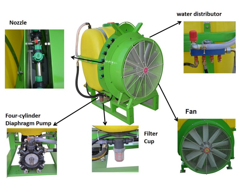 - Działanie: Uruchomić ciągnik i ustawić na prędkość 3-8km/h; włącz wentylator i pompę opryskową, wyreguluj kąt dyszy i ciśnienie w zależności od wysokości i gęstości drzewa.