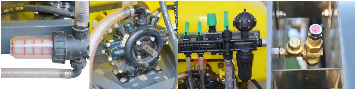 Czwarte to dysze zapobiegające zatykaniu, zapobiegające blokowaniu się zanieczyszczeń i zapewniające równomierny oprysk dla opryskiwacza zaczepianego.